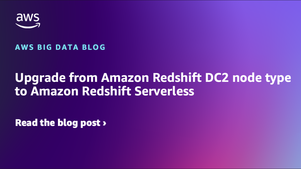 In this post, we show you the upgrade process from DC2 instances to Amazon Redshift Serverless. By using Amazon Redshift Serverless, you can run and scale analytics without managing data warehouse infrastructure.