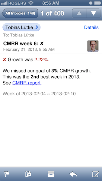 Our internal goal is to reach 3% weekly growth, a very ambitious number given our size. The user interface is simple. Monday mornings, our system sends an email to the team: