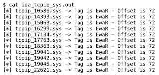 In the end, Gus created an automated and powerful IDA Pro script to automatically locate and analyze RawCreateEndpoint, and then report the pool tag used for the allocation along with the offset where the process reference is stored. The following shows the output from his script across our test set of tcpip.sys versions: