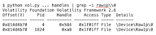 The following shows how Volatility is used to find handles to the “rawip” device in a memory sample infected with the Ursnif malware: