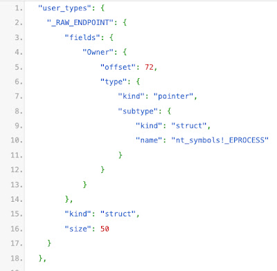 Since we created the _RAW_ENDPOINT type based on our binary analysis, we need to inform Volatility 3 of its definition. This is accomplished through formatting a JSON file that contains the name, members, offsets, and sizes for all structures and their members. The following screenshot shows how we added support for _RAW_ENDPOINT, including marking its owning process, the “Owner” member, at offset “72” as observed in IDA Pro.