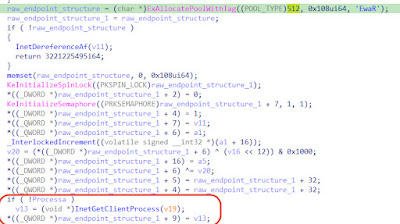 Given our team’s experience in analyzing the Windows 10+ network stack, we were pretty confident that raw sockets would now be created using their own endpoint structure, similar to how the operating system is handling TCP sockets, UDP sockets, and connections. This led us to search for related functions in IDA Pro, which brought us to RawCreateEndpoint. Analysis of this function showed that it did create a new pool allocation for raw sockets, and that the socket references its owning process. Unfortunately, we did not see where raw sockets still track their create time as other socket types still do.