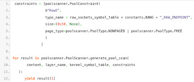 With the information from the above decompilation, we could now develop a relatively simple Volatility 3 plugin to detect raw sockets within Windows 10+ memory samples. The first step of the plugin needed to find raw socket structures. As previously mentioned, our binary analysis showed that raw sockets are allocated within the kernel pool using a tag of “RawE”. Given the importance of pool-based data structures to memory forensics, Volatility 3 has a robust pool-scanning API that only requires plugins to fill in a few pieces of information. The following screenshot shows the few lines of code needed to enable Volatility 3 to find all instances of raw sockets: