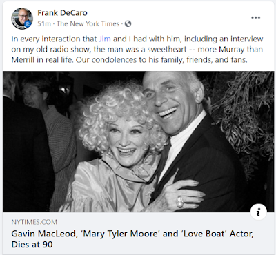 Another sad day in Minneapolis with the passing of WJM "Six O'Clock News" head writer Murray Slaughter. Hard to believe of the cast of "The Mary Tyler Moore Show," the high-strung, overweight boss (Mr. Grant) and the old broad Happy Homemaker (Sue Ann Nivens) are the only main cast members still with us. (For perspective, Georgia Engel was born in 1948, Ed Asner was born in 1929 and Betty White in 1922!) Some have pointed out to me that in his later years, Gavin MacLeod had