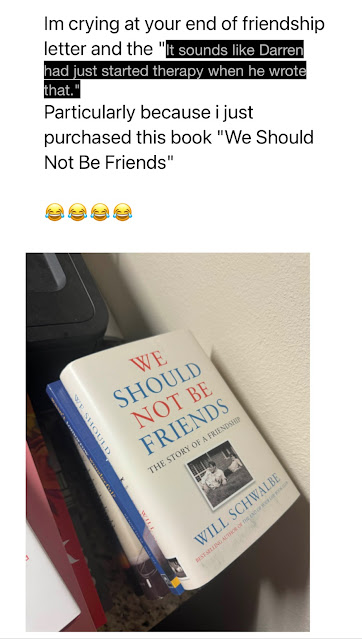"What did you do to Darren?! With that Best Western stationery I wasn’t sure if he’d offed himself after the trauma.""What did you say back in 1991??""I need to hear every goddamn detail about that day. And what came after!!!"