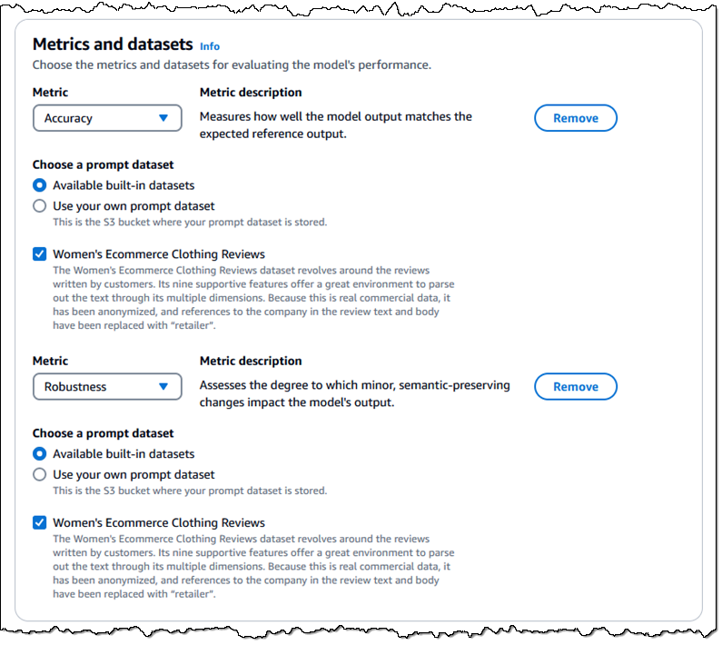 You (or your local subject matter experts) can create a dataset that uses customer support questions, product descriptions, or sales collateral that is specific to your organization and your use case. The built-in datasets include Real Toxicity, BOLD, TREX, WikiText-2, Gigaword, BoolQ, Natural Questions, Trivia QA, and Women’s Ecommerce Clothing Reviews. These datasets are designed to test specific types of tasks and metrics, and can be chosen as appropriate.