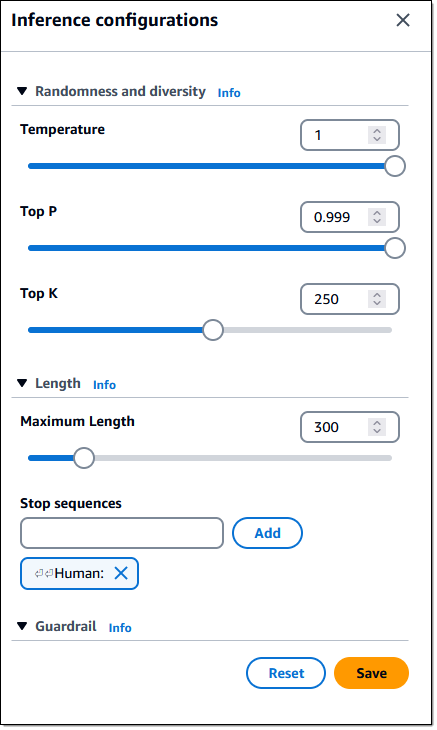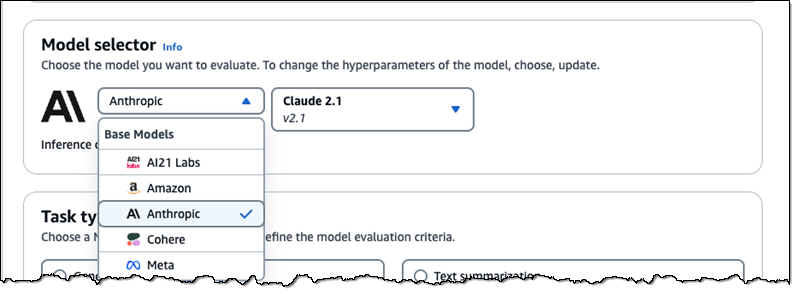 After you select a model you can set the inference configuration that will be used for the model evaluation job: