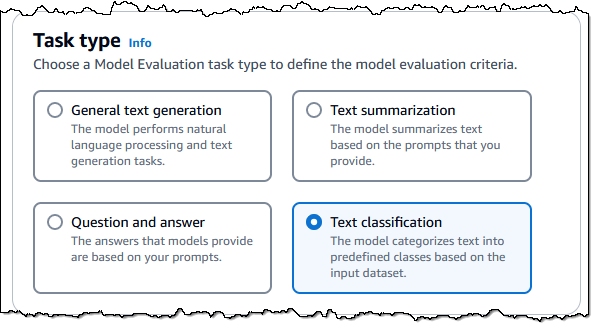 After you select the task type you choose the metrics and the datasets that you want to use to evaluate the performance of the model. For example, if you select Text classification, you can evaluate accuracy and/or robustness with respect to your own dataset or a built-in one: