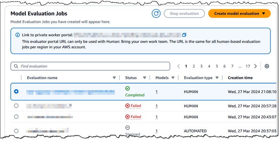 Run Model Evaluation Job – Start the job and wait for it to complete. You can review the status of each of your model evaluation jobs from the console, and can also access the status using the new GetEvaluationJob