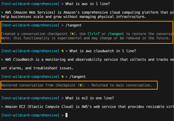 During my content creation process for these presentations, I discovered a useful feature in Amazon Q CLI called tangent mode. This feature has transformed how I stay focused by creating conversation checkpoints that let you explore side topics without losing your main thread.