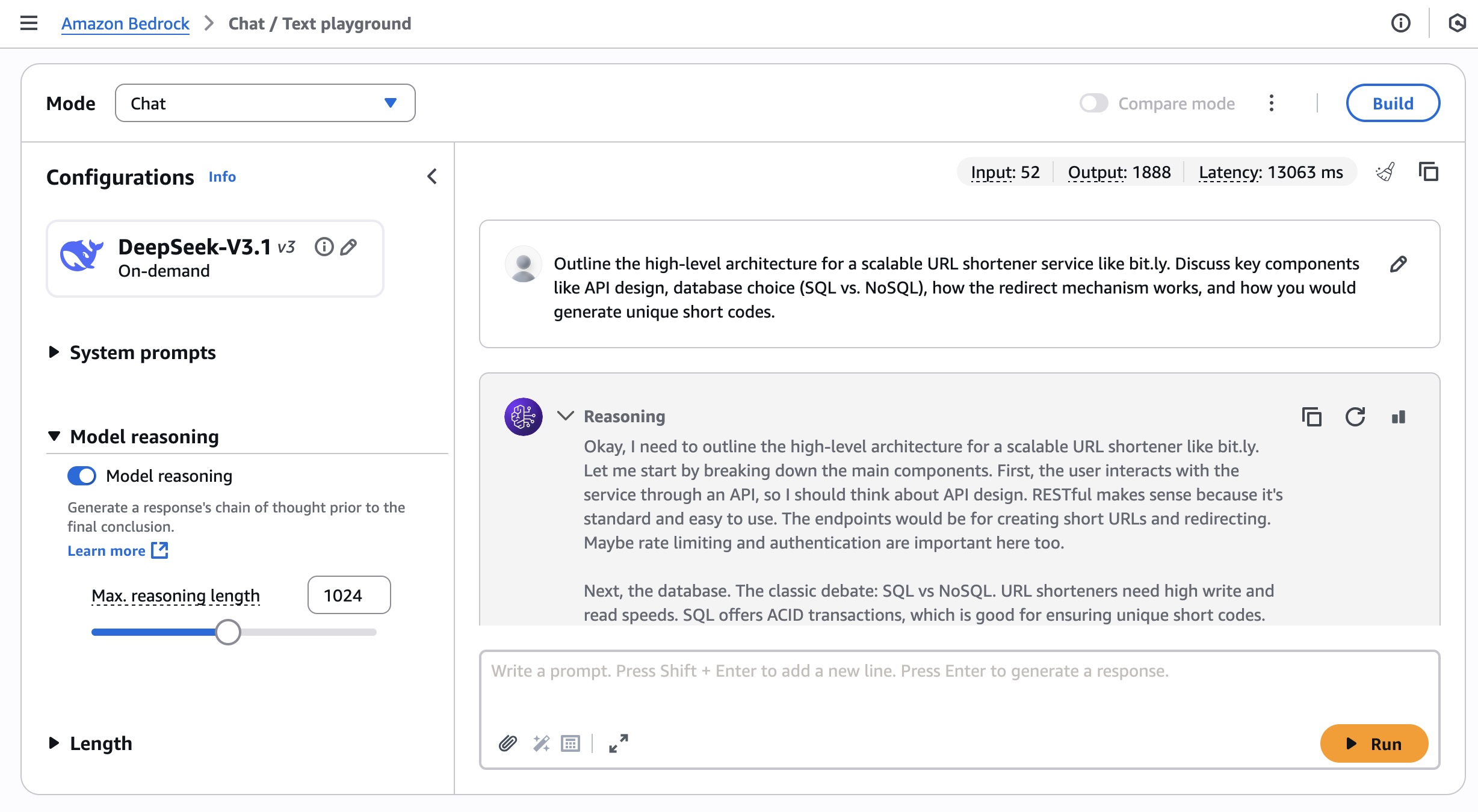 Using the selected DeepSeek-V3.1 model, I run the following prompt example about technical architecture decision.