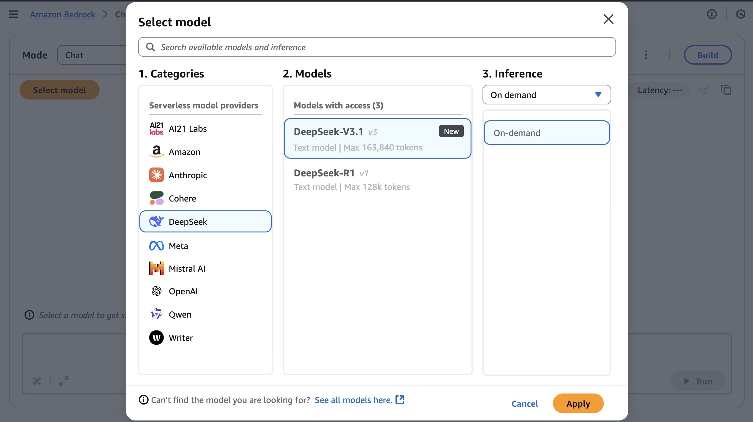 To test the DeepSeek-V3.1 model in Amazon Bedrock console, choose Chat/Text under Playgrounds in the left menu pane. Then choose Select model in the upper left, and select DeepSeek as the category and DeepSeek-V3.1 as the model. Then choose Apply.