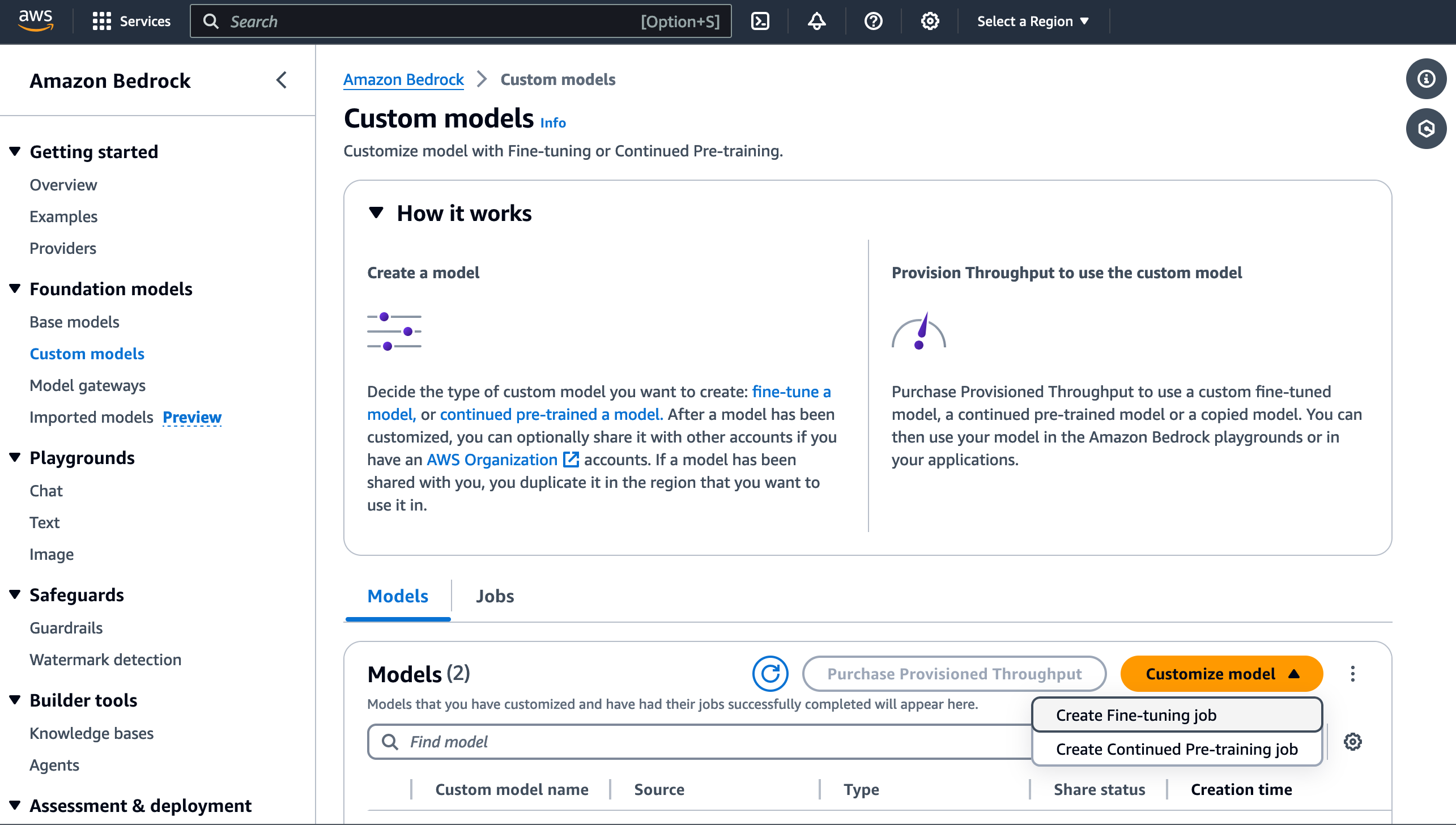 To create a simple fine-tuning job in the Amazon Bedrock console, go to the Foundation models section in the navigation pane and select Custom models. In the Models section, select the Customize model button and then select Create Fine-tuning job.