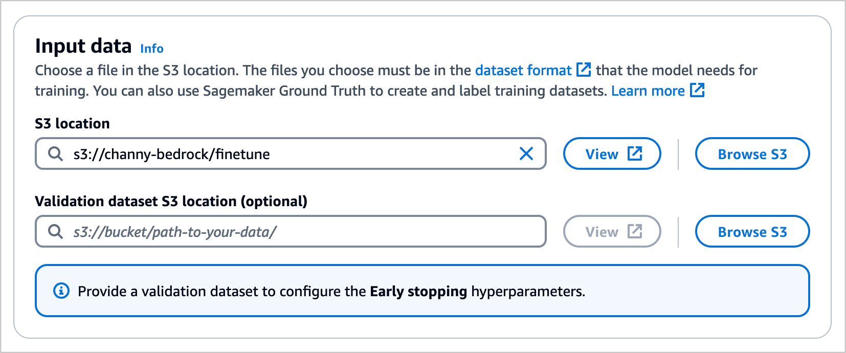 You can select the Amazon S3 location of the training dataset file and, if applicable, the validation dataset file in the Input data section.