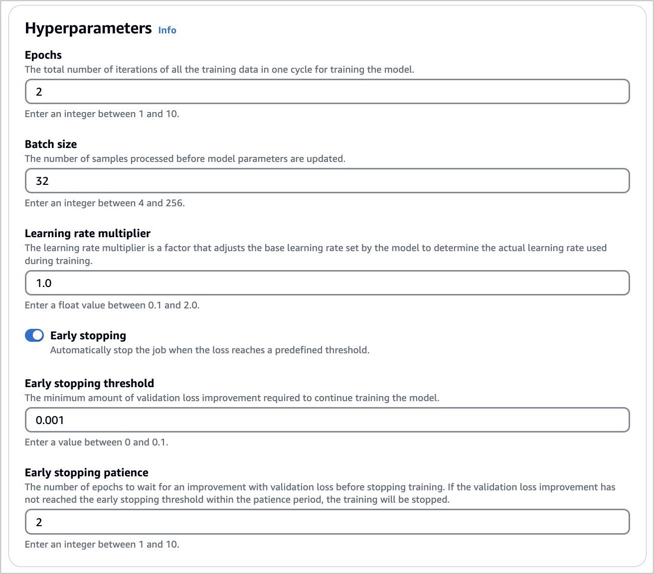In the Hyperparameters section, enter values for hyperparameters to use in training, such as epochs, batch size, and learning rate multiplier. If you’ve included a validation dataset, you can enable Early stopping, a technique used to prevent overfitting and stop the training process when the validation loss stops improving. You can set an early stopping threshold and patience value.