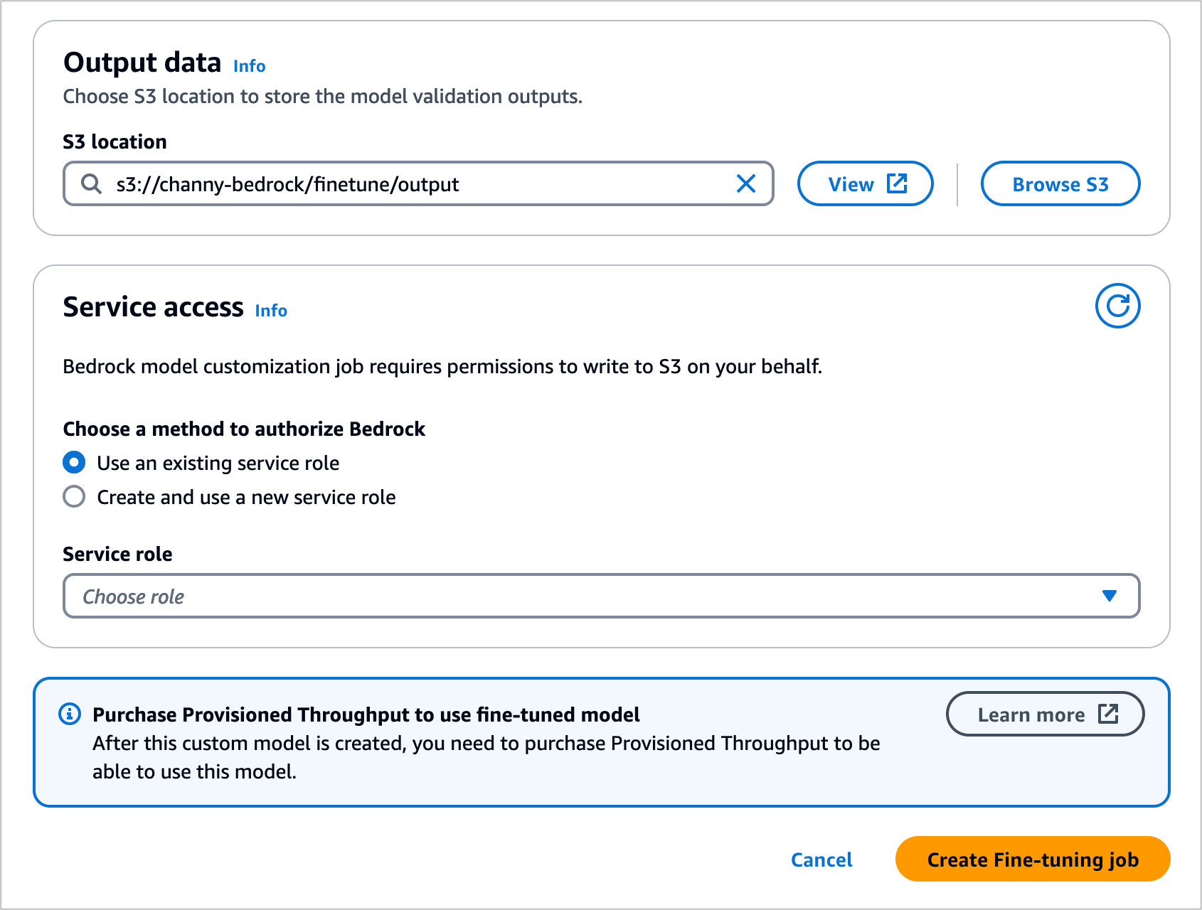 You can also select the output location where Amazon Bedrock should save the output of the job in the Output data section. Choose an AWS Identity and Access Management (IAM) custom service role with the appropriate permissions in the Service access section. To learn more, see Create a service role for model customization in the Amazon Bedrock documentation.