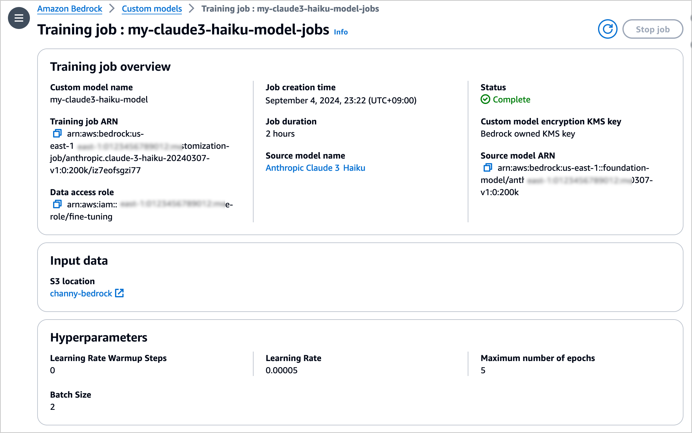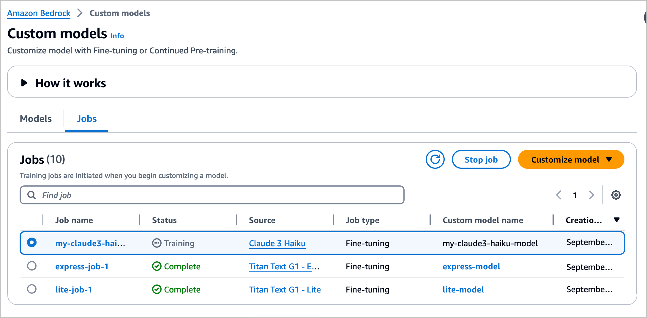 I will demonstrate how to easily fine-tune the Claude 3 Haiku model in Amazon Bedrock. To learn more about the fine-tuning workflow in detail, visit the AWS Machine Learning Blog post, Fine-tune Anthropic’s Claude 3 Haiku in Amazon Bedrock to boost model accuracy and quality.
