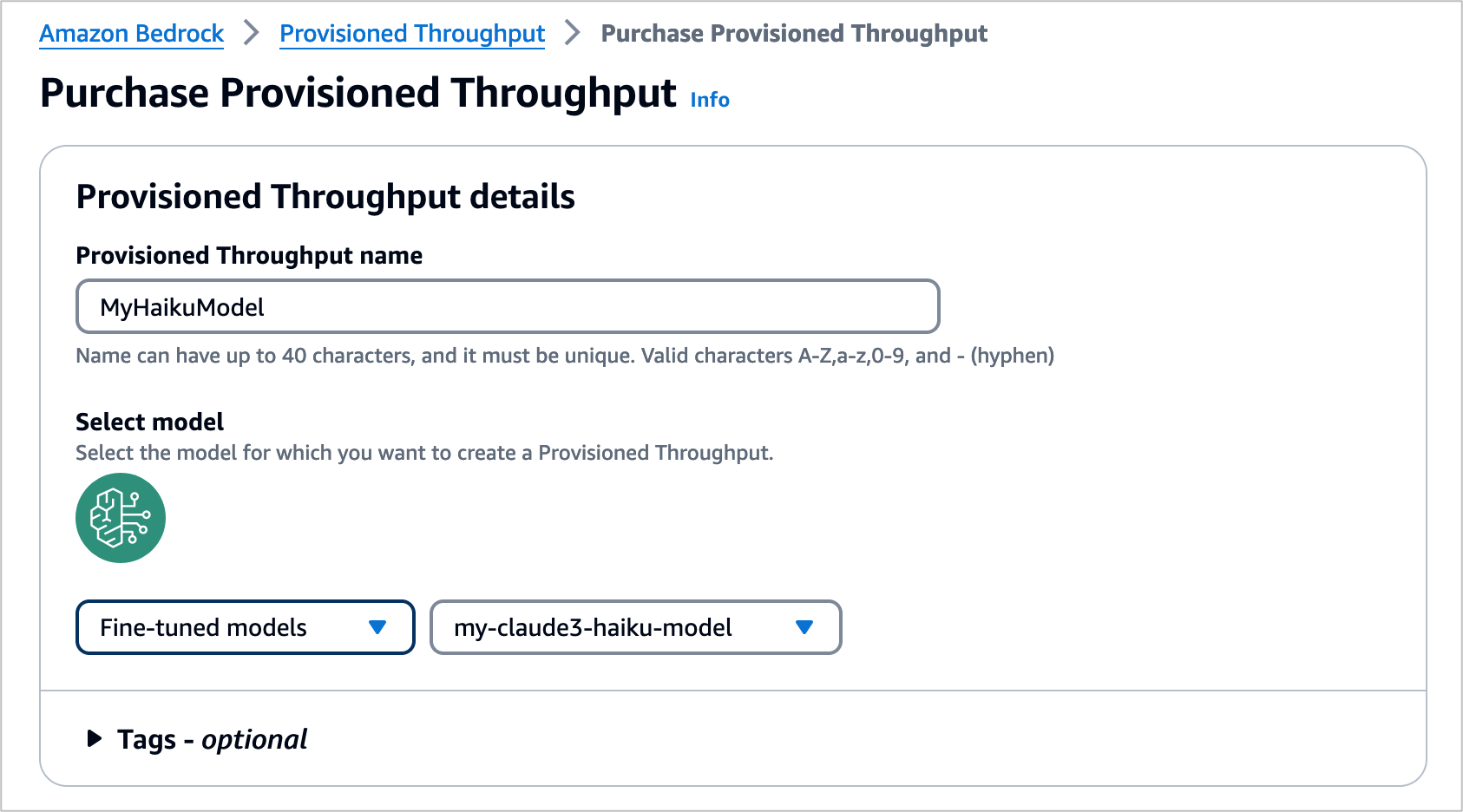 Before using a customized model, you need to purchase Provisioned Throughput for Amazon Bedrock and then use the resulting provisioned model for inference. When you purchase Provisioned Throughput, you can select a commitment term, choose a number of model units, and see estimated hourly, daily, and monthly costs. To learn more about the custom model pricing for the Claude 3 Haiku model, visit Amazon Bedrock Pricing.