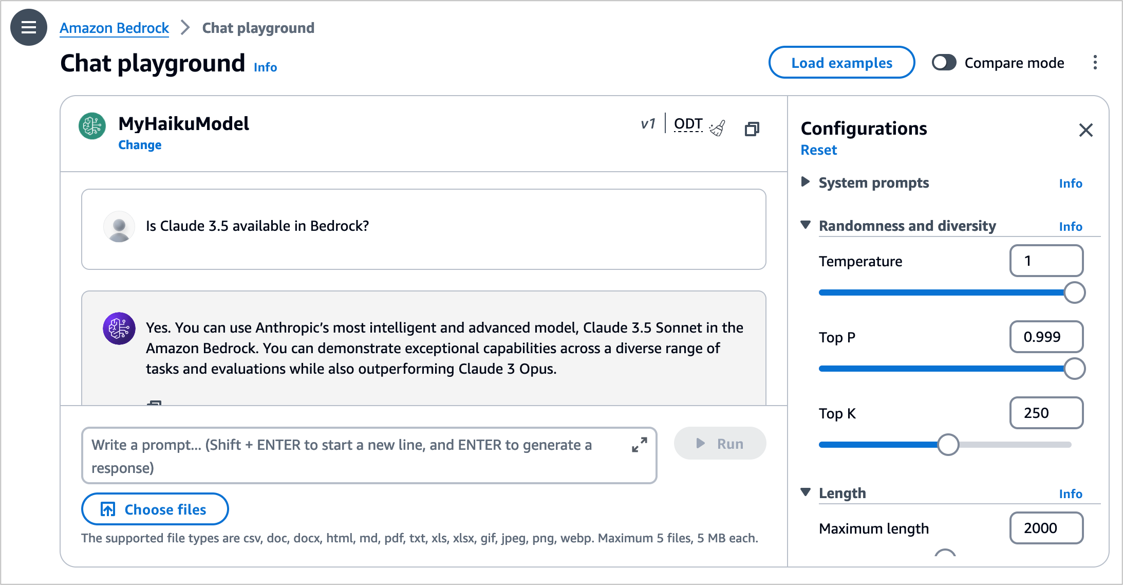 Now, you can test your custom model in the console playground. I choose my custom model and ask whether Anthropic’s Claude 3.5 Sonnet model is available in Amazon Bedrock.