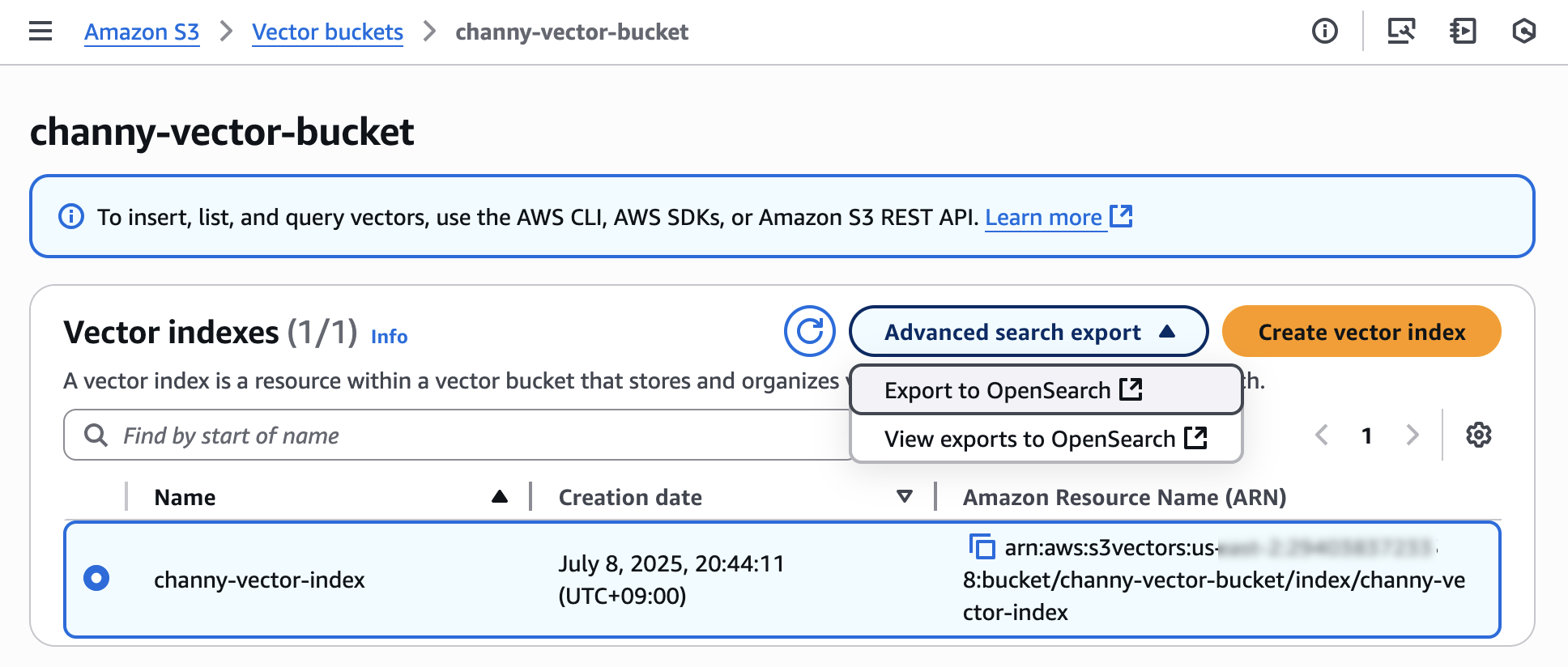 To export your vector index, choose Advanced search export, then choose Export to OpenSearch in the Amazon S3 console.