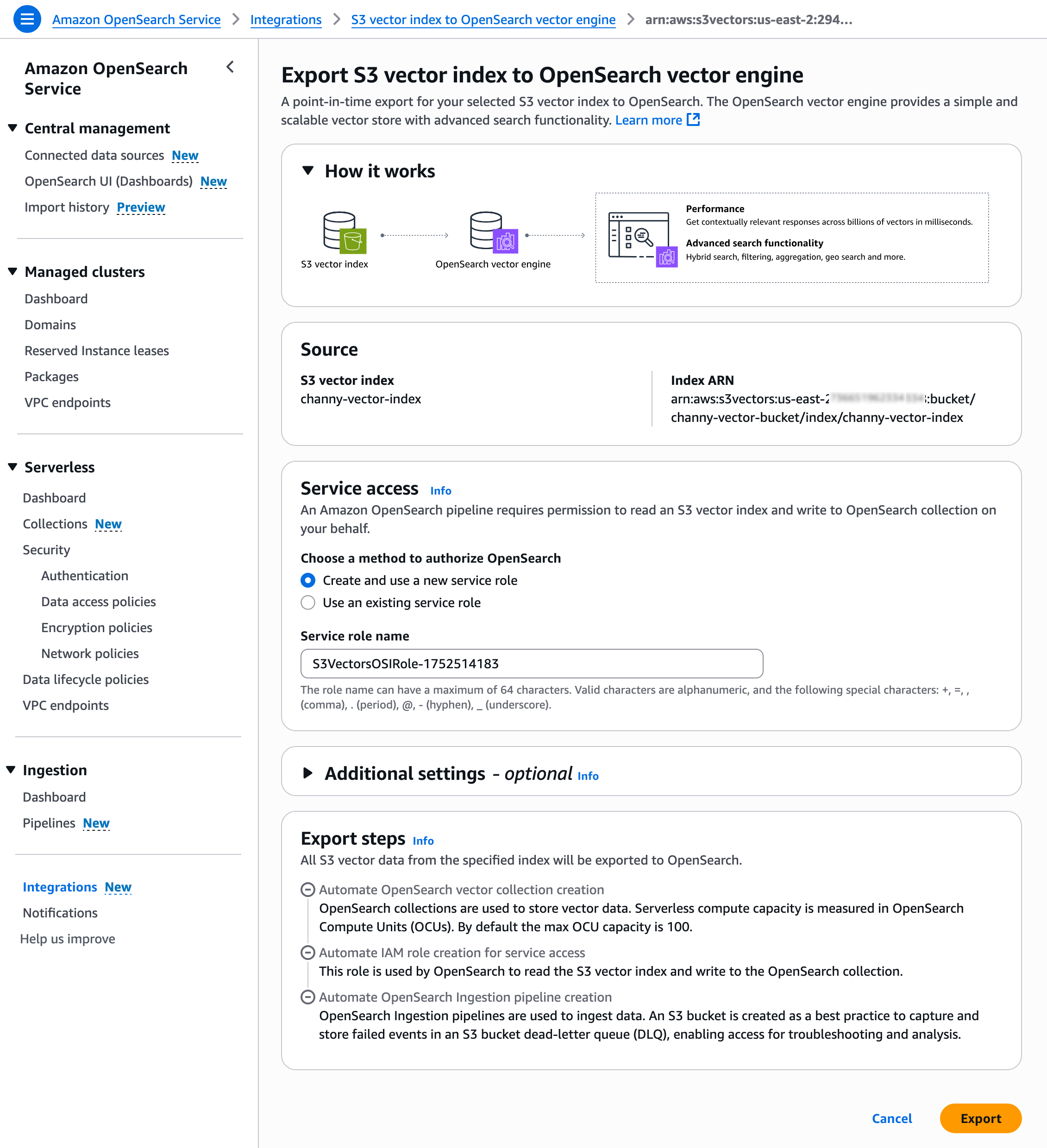 Then, you will be brought to the Amazon OpenSearch Service Integration console with a template for S3 vector index export to OpenSearch vector engine. Choose Export with pre-selected S3 vector source and a service access role.