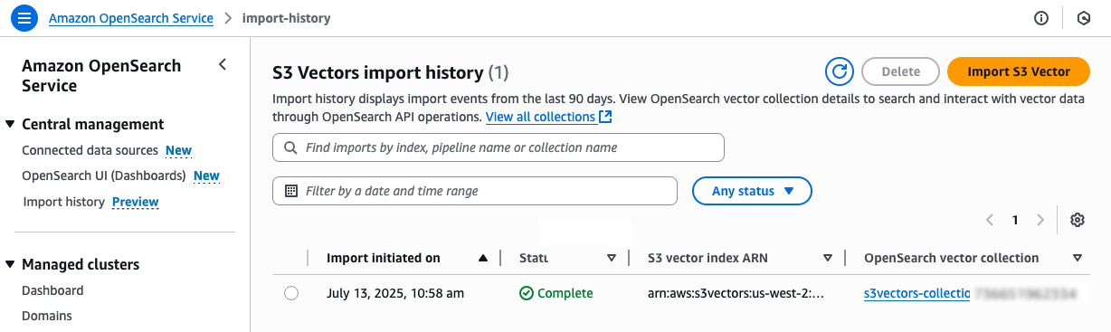Choose the Import history in the left navigation pane. You can see the new import job that was created to make a copy of vector data from your S3 vector index into the OpenSearch Serverless collection.