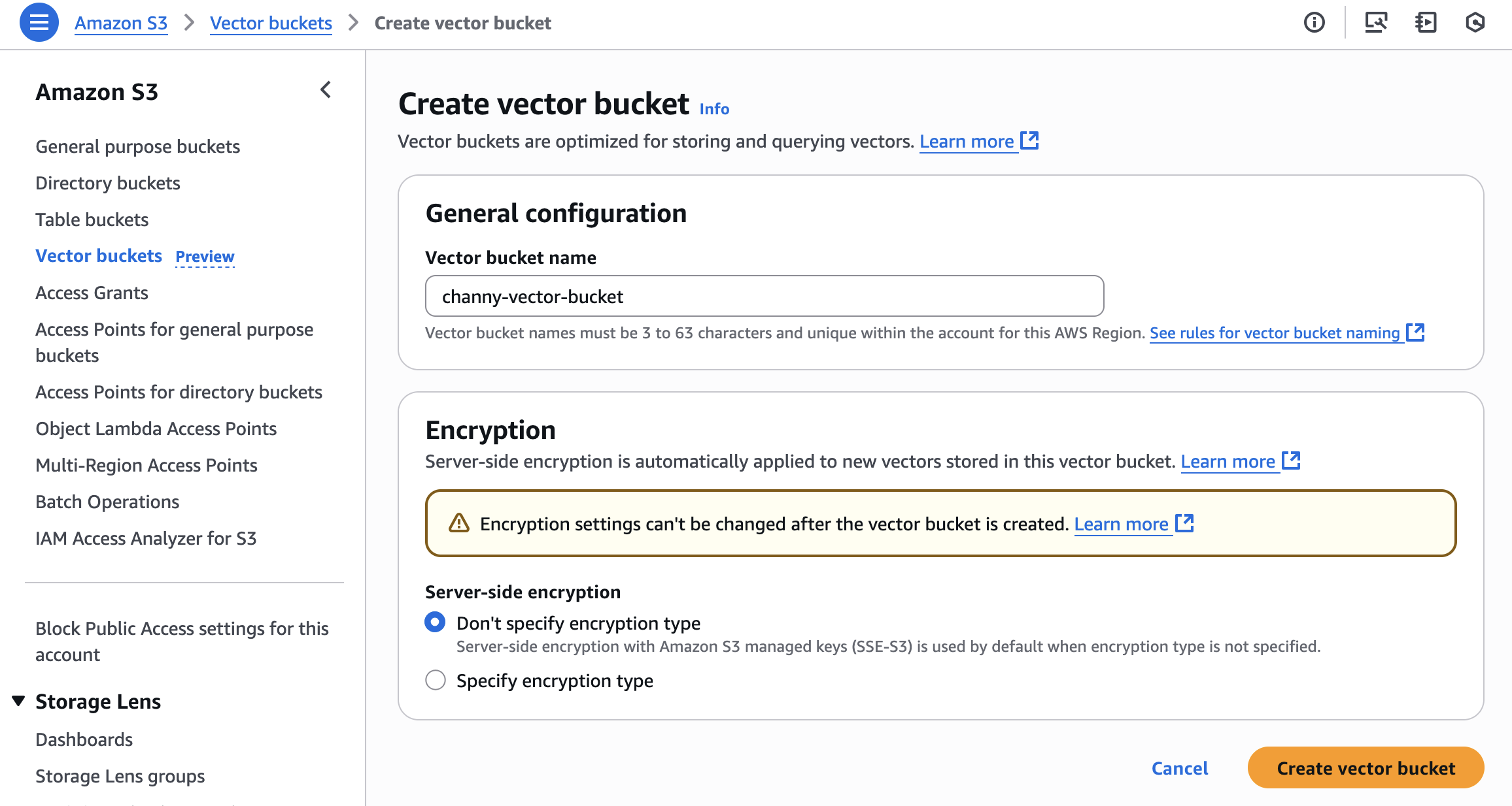 Enter a vector bucket name and choose the encryption type. If you don’t specify an encryption type, Amazon S3 applies server-side encryption with Amazon S3 managed keys (SSE-S3) as the base level of encryption for new vectors. You can also choose server-side encryption with AWS Key Management Service (AWS KMS) keys (SSE-KMS). To learn more about managing your vector bucket, visit S3 Vector buckets in the Amazon S3 User Guide.