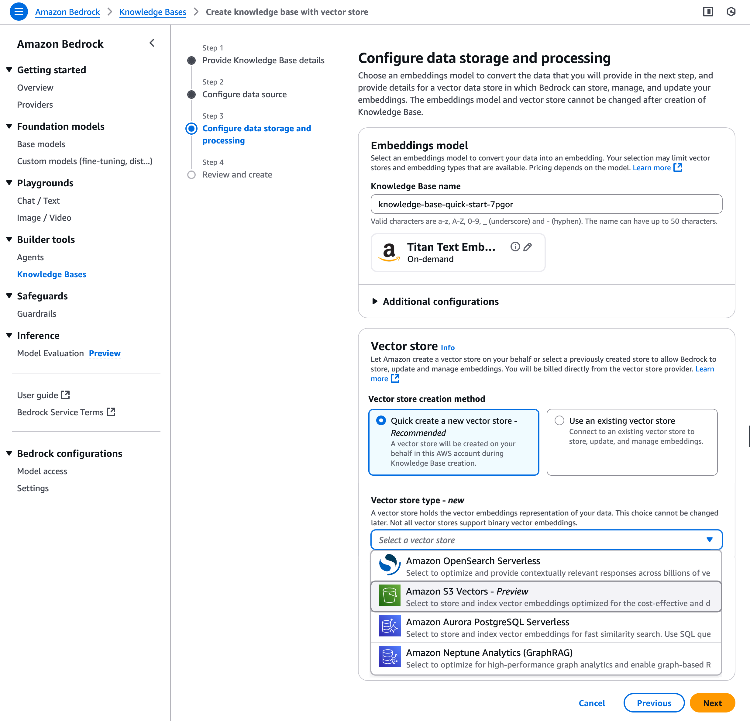 You can use S3 Vectors in Amazon Bedrock Knowledge Bases to simplify and reduce the cost of vector storage for RAG applications. When creating a knowledge base in the Amazon Bedrock console, you can choose the S3 vector bucket as your vector store option.
