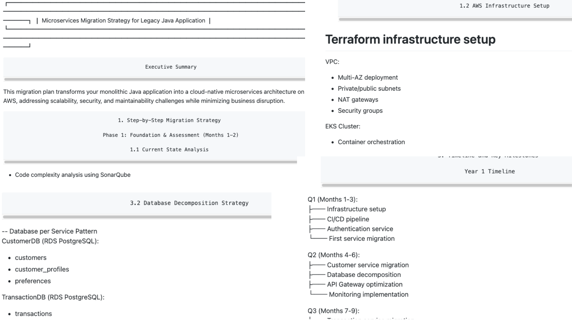 Ok, let’s check the results! As expected, Sonnet 4.5 worked through my requirements and provided extensive and deep guidance for my digital transformation plan that I could start putting into practice. It included an executive summary, a step-by-step migration strategy split into phases with time estimates, and even some code samples to seed the development process and start breaking things down into microservices. It also provided the business cases for introducing technology and recommended the correct AWS services for each scenario. Here are some highlights from the report.