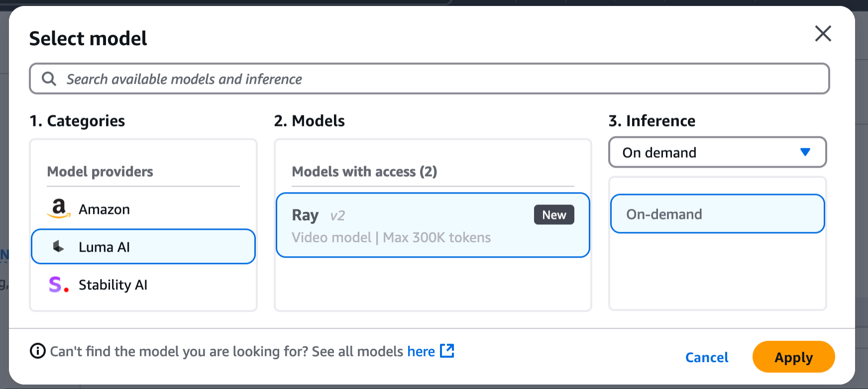 To test the Luma AI model in Amazon Bedrock, choose Image/Video under Playgrounds in the left menu pane. Choose Select model, then select Luma AI as the category and Ray as the model.