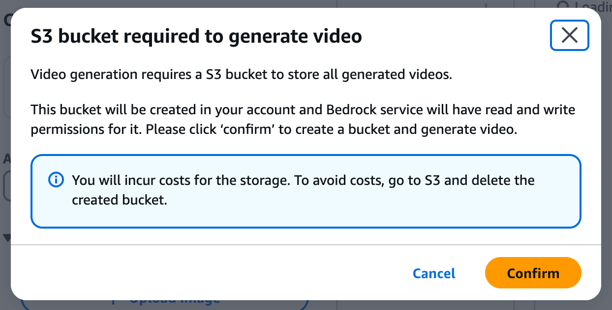 For video generation models, you should have an Amazon Simple Storage Service (Amazon S3) bucket to store all generated videos. This bucket will be created in your AWS account, and Amazon Bedrock will have read and write permissions for it. Choose Confirm to create a bucket and generate a video.