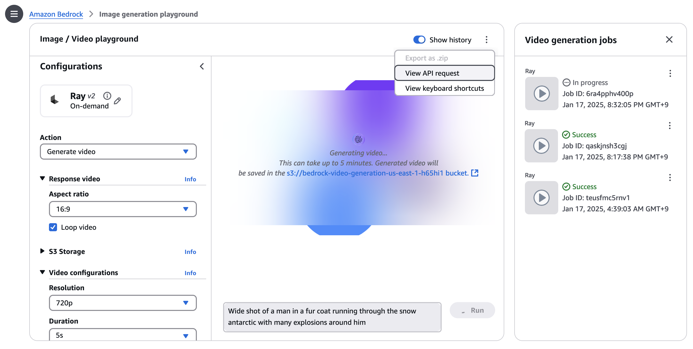 By choosing View API request in the Bedrock console, you can also access the model using code examples in the AWS Command Line Interface (AWS CLI) and AWS SDKs. You can use luma.ray-v2:0