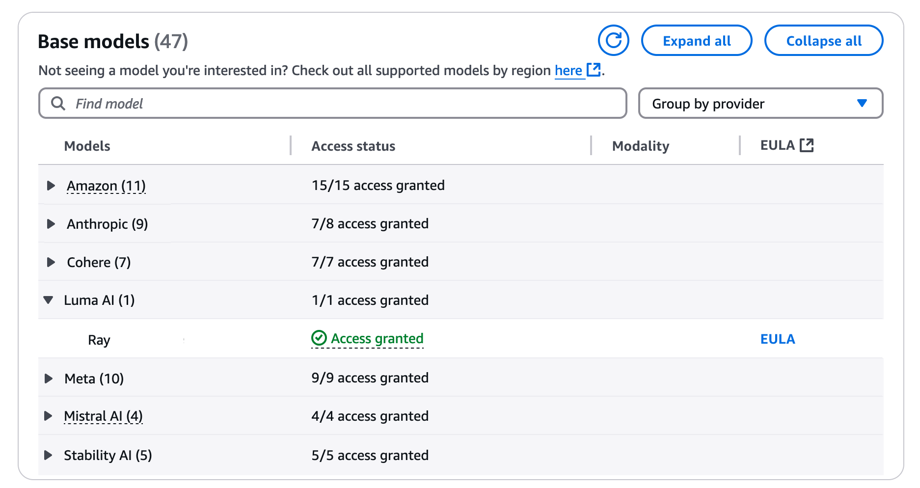 Before getting started, if you are new to using Luma models, go to the Amazon Bedrock console and choose Model access on the bottom left pane. To access the latest Luma AI models, request access for Luma Ray2 in Luma AI.