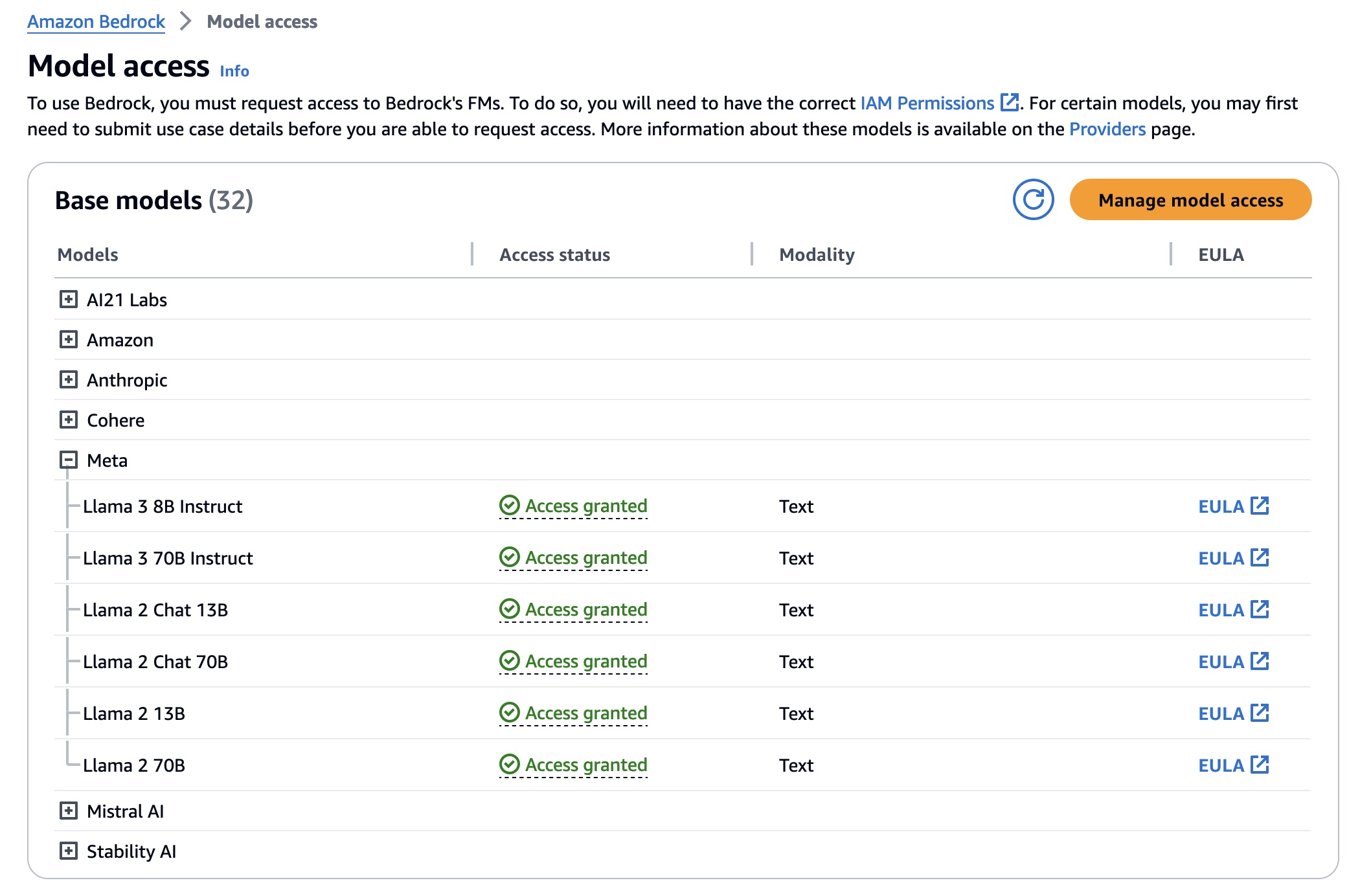 If you are new to using Meta models, go to the Amazon Bedrock console and choose Model access on the bottom left pane. To access the latest Llama 3 models from Meta, request access separately for Llama 3 8B Instruct or Llama 3 70B Instruct.