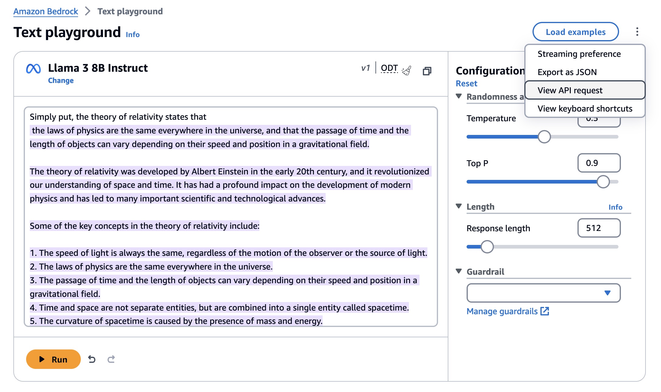 By choosing View API request, you can also access the model using code examples in the AWS Command Line Interface (AWS CLI) and AWS SDKs. You can use model IDs such as meta.llama3-8b-instruct-v1