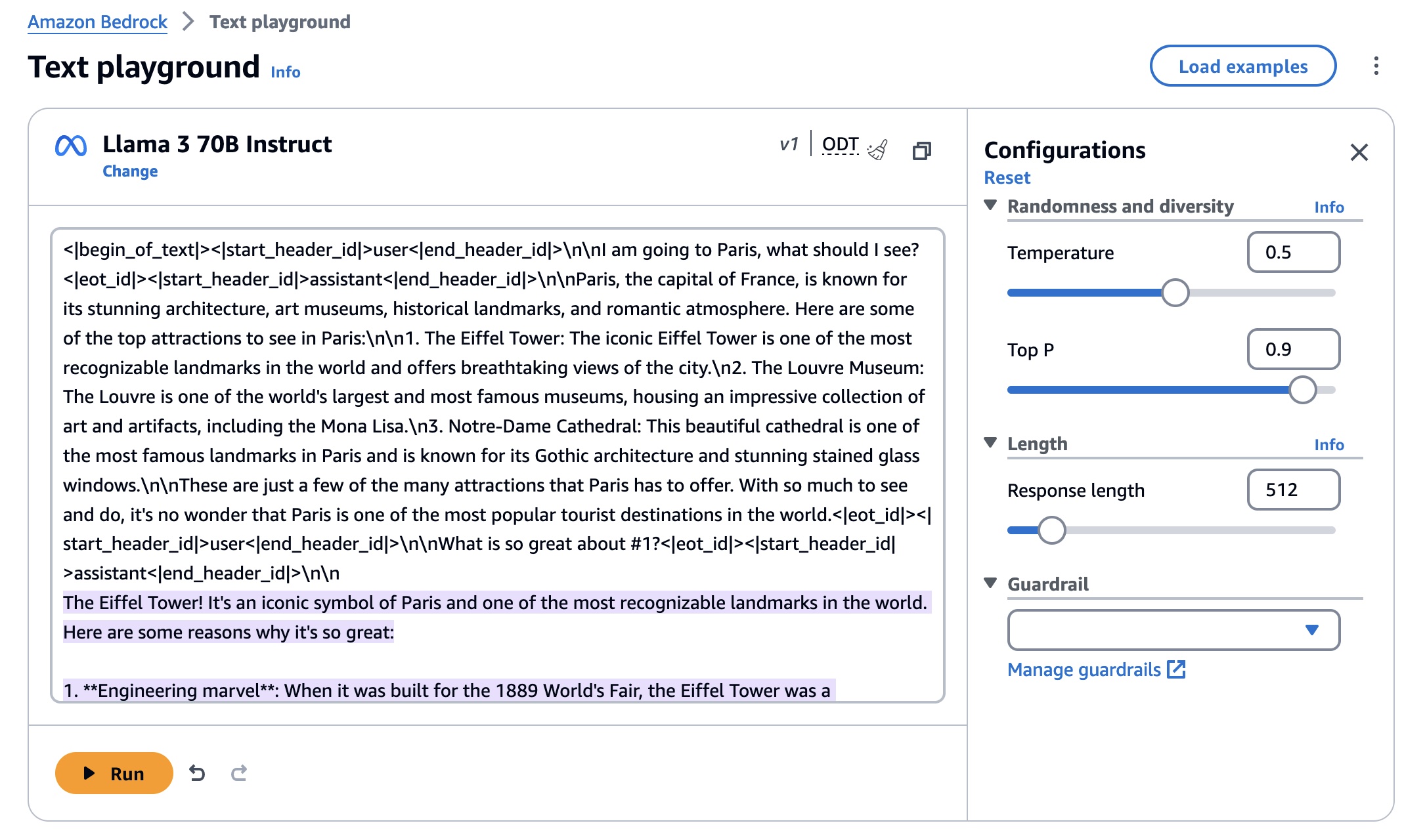 You can use code examples for Amazon Bedrock using AWS SDKs to build your applications with various programming languages. The following Python code examples show how to invoke the Llama 3 Chat model in Amazon Bedrock for text generation.