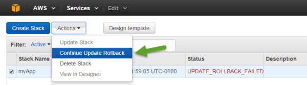 In the AWS CloudFormation console, select the stack, choose Actions, and then choose Continue Update Rollback.