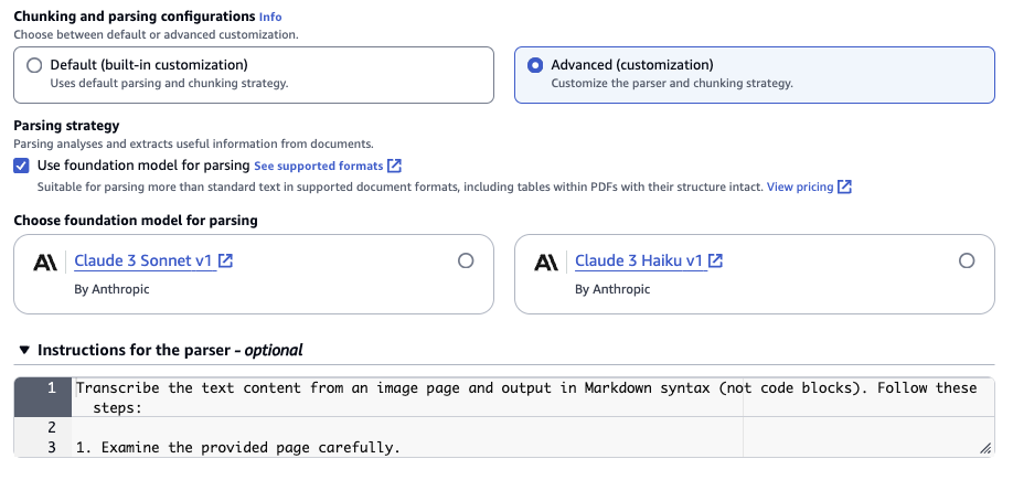 From the AWS Management Console for Amazon Bedrock, you can start creating a knowledge base by choosing Create knowledge base. In Step 2: Configure data source, select Advanced (customization) under Chunking & parsing configurations, as shown in the following image. You can select one of the two models (Anthropic Claude 3 Sonnet or Haiku) currently available for parsing the documents.