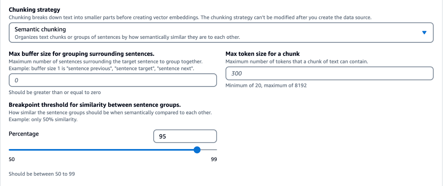 - Breakpoint threshold for similarity between sentence groups: Specify (by a percentage threshold) how similar the groups of sentences should be when semantically compared to each other. It should be a value between 50 and 99. The recommended value of this parameter is 95.