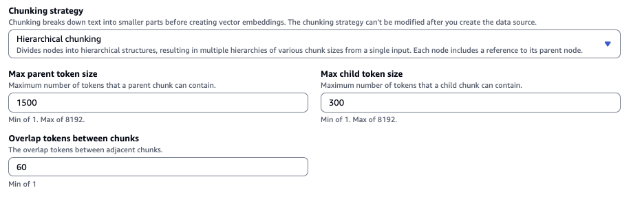 Based on your configuration, the ingestion process will parse and chunk documents, enhancing the overall response accuracy. We will now explore advanced data chunking options, namely semantic and hierarchical chunking which splits the documents into smaller units, organizes and store chunks in a vector store, which can improve the quality of chunks during retrieval.