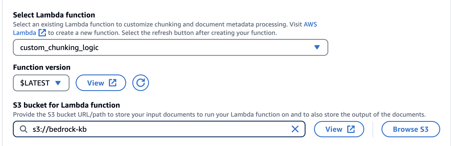 For those seeking more control and flexibility, Amazon Bedrock Knowledge Bases now offers the ability to define custom processing logic using AWS Lambda functions. Using Lambda functions, you can customize the chunking process to align with the unique requirements of your RAG application. Furthermore, you can extend it beyond chunking, because Lambda can also be used to streamline metadata processing, which can help unlock additional avenues for efficiency and precision.