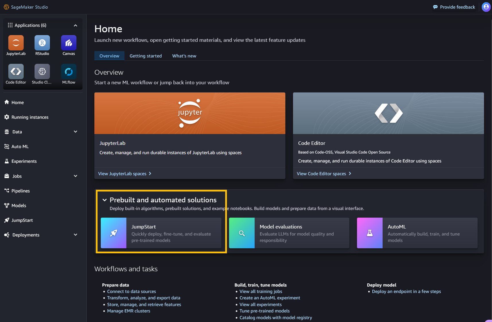For more information about SageMaker JumpStart, see Train, deploy, and evaluate pretrained models with SageMaker JumpStart and Getting started with Amazon SageMaker JumpStart.