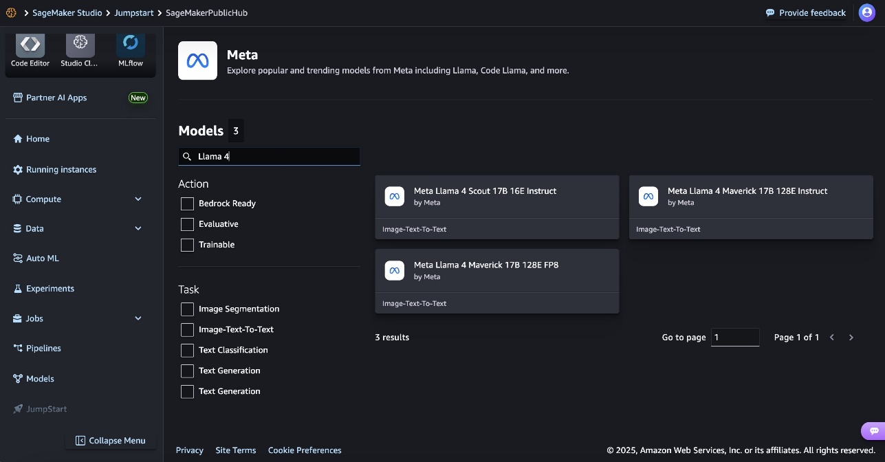 If you’re using SageMaker Classic Studio and don’t see the Llama 4 models, update your SageMaker Studio version by shutting down and restarting. For more information about version updates, see Shut down and Update Studio Classic Apps.