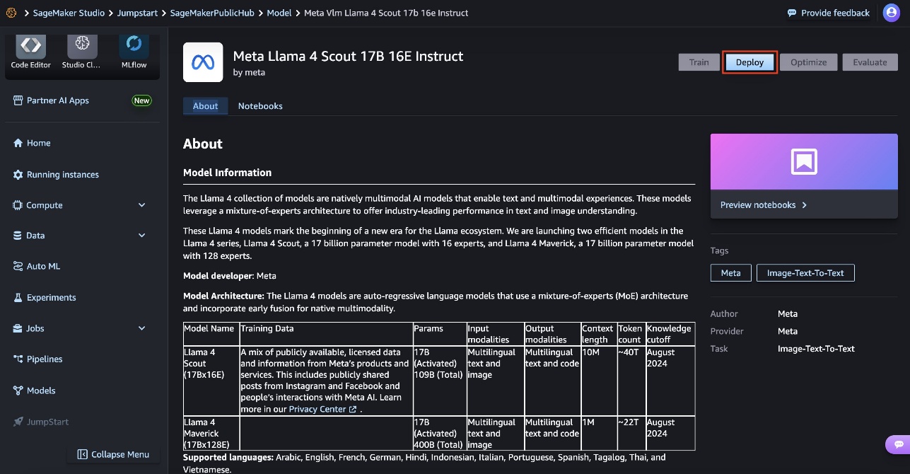 By fine-tuning on diverse multimodal datasets, customers can create specialized AI systems that process both text and visual elements to understand and reason about the world more holistically, representing a significant advancement in tailored AI solutions. In this blog post, we walk you through how to deploy and prompt a Llama-4-Scout-17B-16E-Instruct model using SageMaker JumpStart.