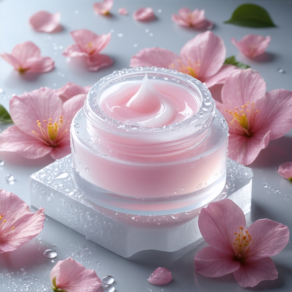 Prompt without weights “editorial product photo of a translucent gel moisturizer jar placed on a frosted glass pedestal, surrounded by dewy pink flower petals, with soft, subtle water droplets, shallow depth of field” |