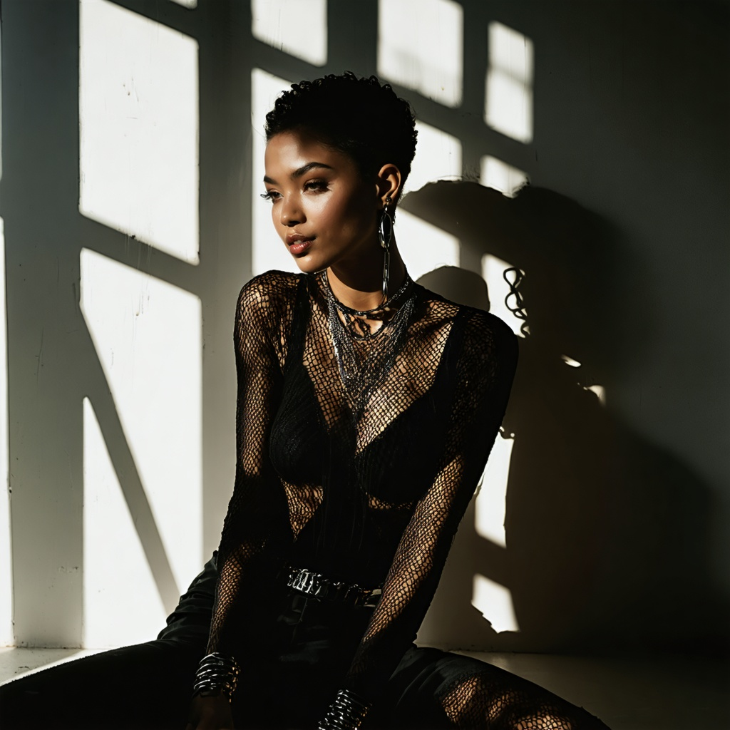 “fashion editorial portrait of a woman with medium-brown skin and short coiled hair, wearing an asymmetrical black mesh top and metallic jewelry, seated with shoulders angled and one arm lifted, eyes locked on camera, bathed in intersecting beams of hard directional light through window slats, layered shadows and highlights sculpting her face and body, high-contrast chiaroscuro lighting, abstract and bold, shot on 85mm in studio” | ![]() |