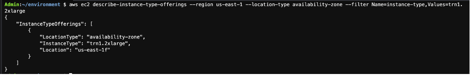 aws ec2 describe-instance-type-offerings --region us-east1 --location-type availability-zone --filter Name=instance-type,Values=trn1.2xlarge