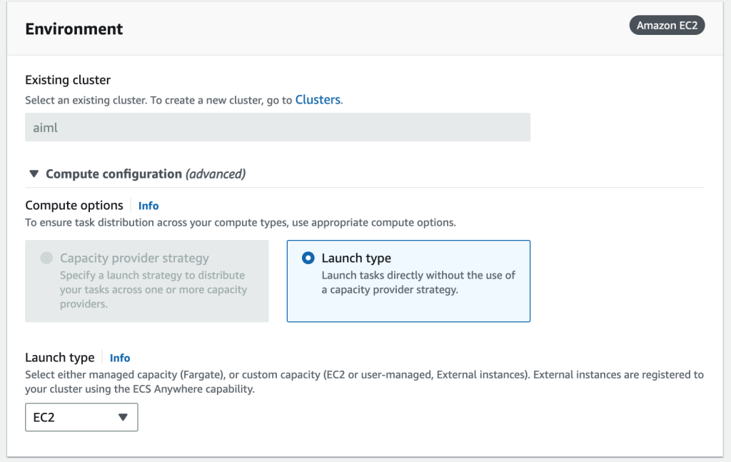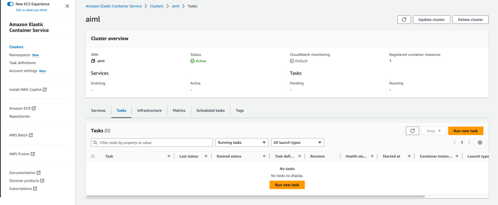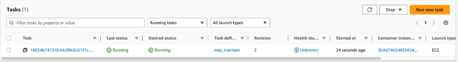 After we have created the ECS cluster, pushed the image to Amazon ECR, and created the task definition, we run the task definition to train a model on Amazon ECS.