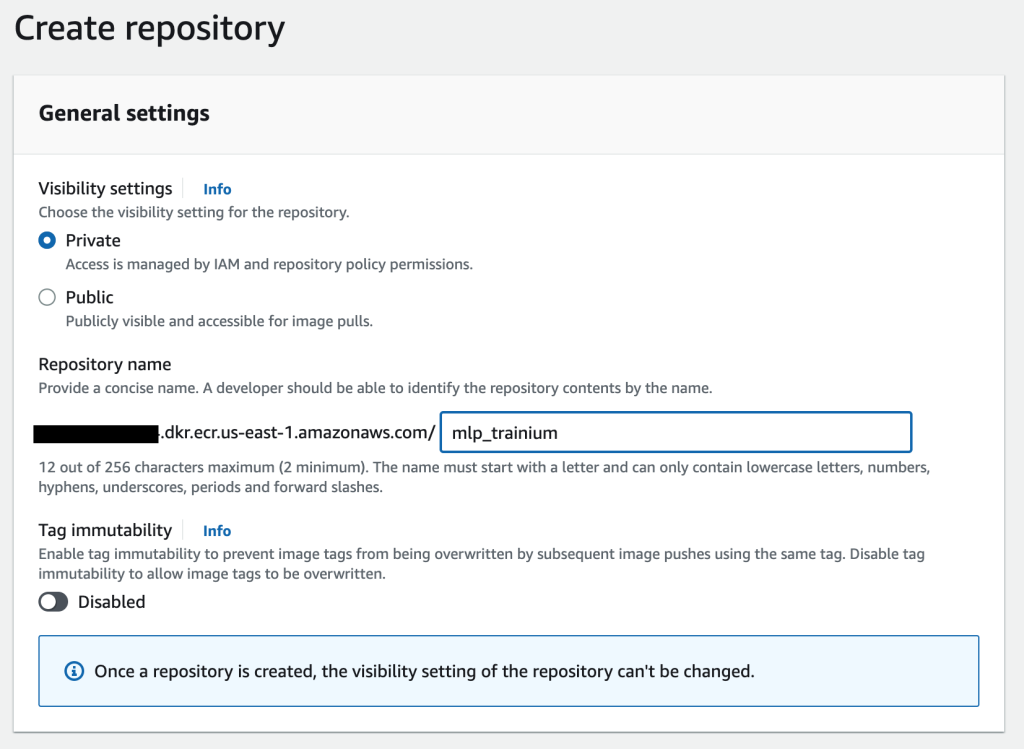 Amazon ECR is a fully managed container registry offering high-performance hosting, so you can reliably deploy application images and artifacts anywhere. We use Amazon ECR to store a custom Docker image containing our scripts and Neuron packages needed to train a model with ECS jobs running on Trn1 instances. You can create an ECR repository using the AWS Command Line Interface (AWS CLI) or AWS Management Console. For this post, we use the console. Complete the following steps: