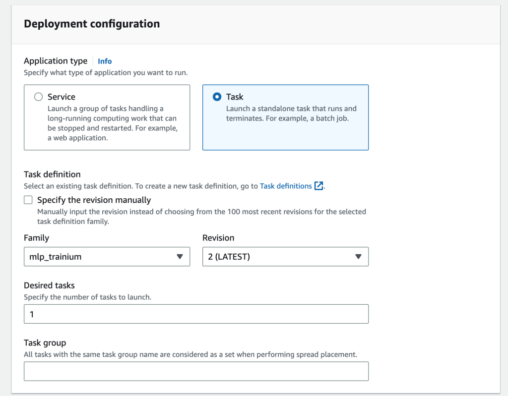 - Create a task definition to define an ML training job to be run by Amazon ECS.